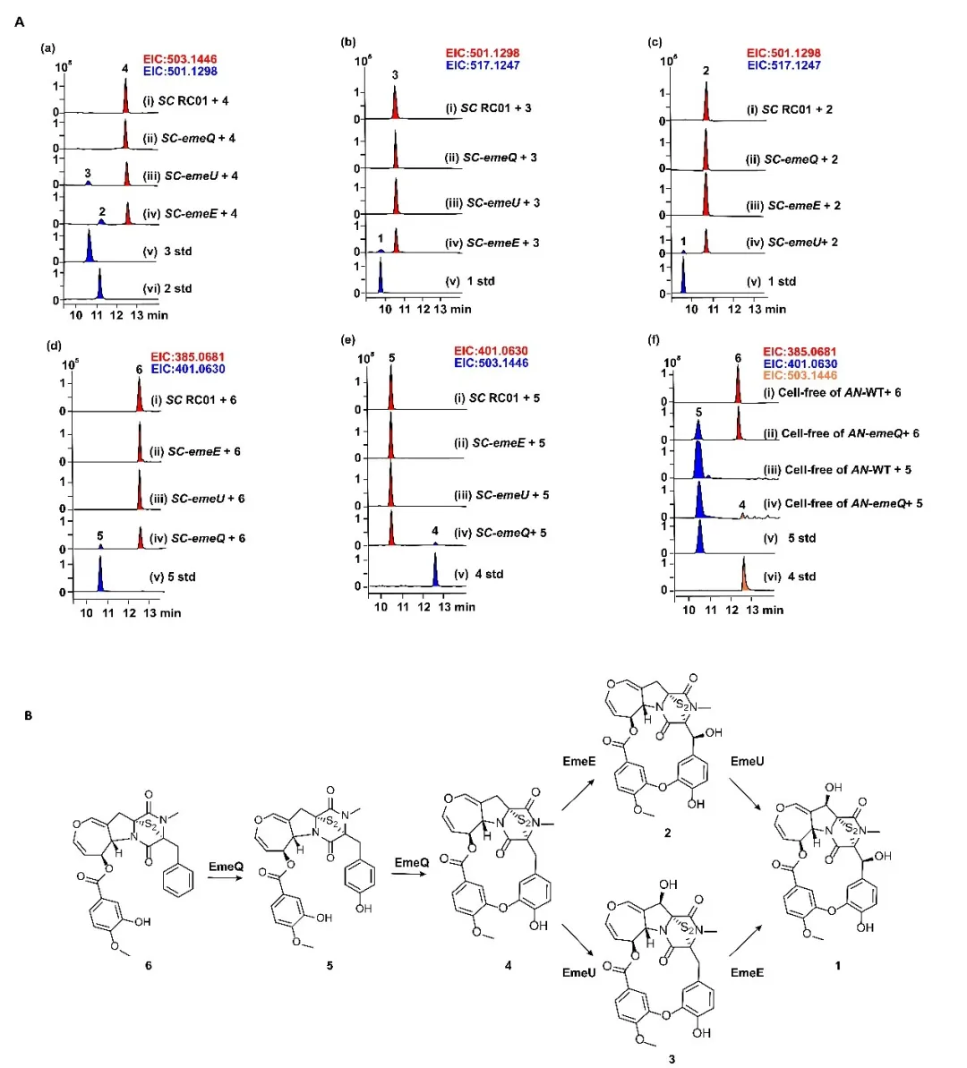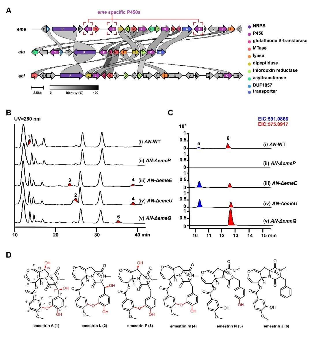 By integrating gene knockout, heterologous expression, feeding experiments, in vitro enzymatic assays, and computational simulations, the team systematically mapped out the late-stage biosynthetic pathway. They identified a gene cluster responsible for emestrin production and characterized the functional division of three P450 enzymes. Notably, one enzyme—EmeQ—was found to catalyze both aromatic hydroxylation and phenolic oxidative coupling, directly forming the macrocyclic structure in a single enzymatic cascade.