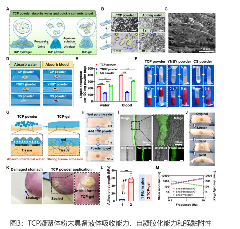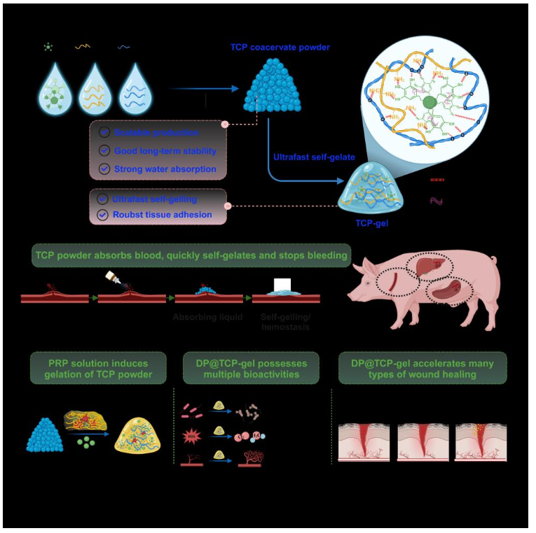 Prof. ZHANG Zhiping's team has developed a novel coacervate powder (TCP) that transforms into a strong adhesive hydrogel upon contact with moist tissues. This innovative material addresses key limitations of existing hemostatic agents by offering immediate bleeding control coupled with antibacterial and tissue-regenerating capabilities.
