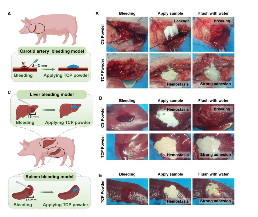 The TCP powder's unique composition – combining tannic acid, chitosan, and polyethylene glycol – allows it to form an exceptionally strong bond with wet tissue surfaces within one minute. In animal tests, it stopped bleeding in just 10 seconds in rat models and effectively controlled severe bleeding in pig carotid artery and organ injury scenarios, outperforming commercial products like fibrin glue and chitosan-based hemostats.