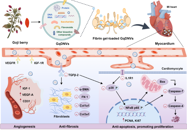 In the first study, published in Journal of Nanobiotechnology (IF 2024 = 12.6), the team developed a fibrin gel loaded with exosome-like nanovesicles derived from goji berries (GqDNVs-gel) to target and repair heart tissue after myocardial infarction. The gel system significantly improved survival rates, cardiac function, and tissue regeneration in animal models within 14 days post-infarction. Multi-omic analyses revealed that the therapeutic effects are mediated through suppression of the p38 MAPK/NF-κB pathway and restoration of the upset balance of lipid metabolism. The technology has been granted a patent and represents a promising clinical strategy for heart attack recovery.